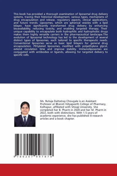 This book has provided a thorough examination of liposomal drug delivery systems, tracing their historical development, various types, mechanisms of drug encapsulation and release, regulatory aspects, clinical applications, and future trends. Liposomes, which are spherical vesicles with a lipid bilayer, have significantly transformed drug delivery by enhancing bioavailability, reducing toxicity, and enabling targeted therapy. Their unique capability to encapsulate both hydrophilic and hydrophobic drugs makes them highly versatile carriers in the pharmaceutical landscape.The evolution of liposomal technology has led to the development of several distinct types of liposomes, each tailored to specific therapeutic needs. Conventional liposomes serve as basic lipid bilayers for general drug encapsulation. PEGylated liposomes, modified with polyethylene glycol, extend circulation time and improve stability. Immunoliposomes are conjugated with antibodies or ligands, allowing for targeted delivery to specific cells.