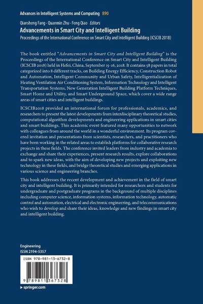 The book entitled "Advancements in Smart City and Intelligent Building" is the Proceedings of the International Conference on Smart City and Intelligent Building (ICSCIB 2018) held in Hefei, China, September 15-16, 2018. It contains 58 papers in total categorized into 8 different tracks, on Building Energy Efficiency, Construction Robot and Automation, Intelligent Community and Urban Safety, Intelligentialization of Heating Ventilation Air Conditioning System, Information Technology and Intelligent Transportation Systems, New Generation Intelligent Building Platform Techniques, Smart Home and Utility, and Smart Underground Space, which cover a wide range areas of smart cities and intelligent buildings.