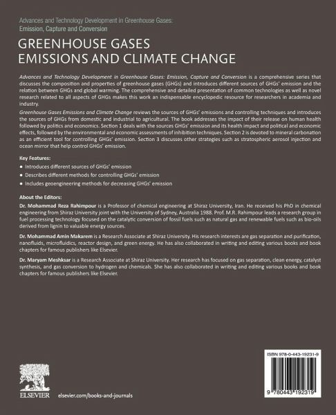 Section I: Greenhouse Gases Emission 1. Methane emission from coal-bed 2. Domestic source of greenhouse gas emission 3. Reserves and natural gas source of methane emission 4. Agriculture and food processing source of greenhouse gas emission 5. Livestock as a source of greenhouse gas emission 6. Landfill source of greenhouse gas emission 7. Greenhouse gases emission from transportation 8. Greenhouse gases emission from industries 9. Greenhouse gases emissions from buildings 10. Melting permafrost and fire as sources of greenhouse gas emission 11. Greenhouse gases emission from edible insect species 12. Soil as a natural source of greenhouse gases emission 13. Health impacts of greenhouse gases emissions on humans and the environment 14. Political and economic effects of greenhouse gases emission 15. Economic assessments of inhibiting technologies for greenhouse gas emission 16. Environmental policy tools for reducing greenhouse gases emission Section II: Mineral Carbonation for Controlling Greenhouse Gases Emission 17. Introduction to carbonation mechanisms and applications 18. CO2 mineralization feedstock types 19. Applications of CO2 mineralization for carbon storage 20. Economic assessment and environmental challenges of CO2 storage through mineral carbonation Section III: Other Strategies for Controlling Greenhouse Gases Emissions 21. Dark and thick stratocumulus clouds for controlling greenhouse gases emission 22. Stratospheric aerosol injection for controlling greenhouse gases emission 23. Marine cloud brightening for controlling greenhouse gases emission 24. Ocean mirror as a way of controlling greenhouse gases emission 25. Carbon footprint as a tool to limit greenhouse gas emission