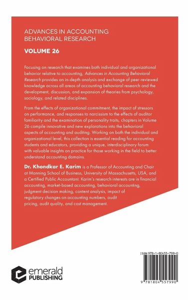 Volume 26 of Advances in Accounting Behavioral Research compiles innovative and new explorations into the behavioral aspects of accounting and auditing including the effects of organizational commitment, the impact of stressors on performance, the effects of auditor familiarity and the examination of personality traits.