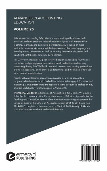 Advances in Accounting Education features 13 papers surrounding four themes: curriculum and pedagogical innovations, faculty reflections on teaching accounting during the COVID-19 pandemic, research on passing professional exams in accounting, and historical underpinnings and the choice of taxation as an area of specialization.