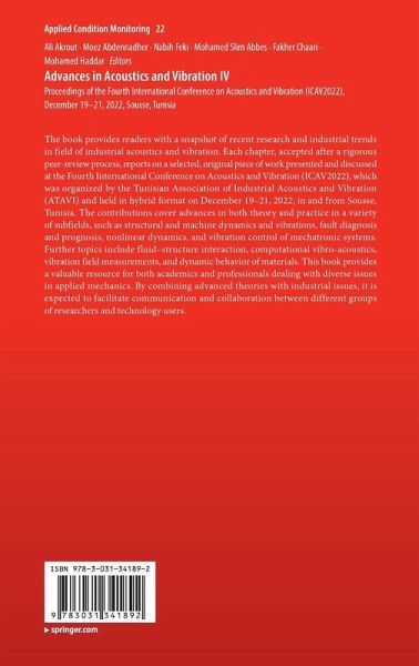 The book provides readers with a snapshot of recent research and industrial trends in field of industrial acoustics and vibration. Each chapter, accepted after a rigorous peer-review process, reports on a selected, original piece of work presented and discussed at the Fourth International Conference on Acoustics and Vibration (ICAV2022), which was organized by the Tunisian Association of Industrial Acoustics and Vibration (ATAVI) and held in hybrid format on December 19-21, 2022, in and from Sousse, Tunisia. The contributions cover advances in both theory and practice in a variety of subfields, such as structural and machine dynamics and vibrations, fault diagnosis and prognosis, nonlinear dynamics, and vibration control of mechatronic systems. Further topics include fluid-structure interaction, computational vibro-acoustics, vibration field measurements, and dynamic behavior of materials. This book provides a valuable resource for both academics and professionals dealing with diverse issues in applied mechanics. By combining advanced theories with industrial issues, it is expected to facilitate communication and collaboration between different groups of researchers and technology users.