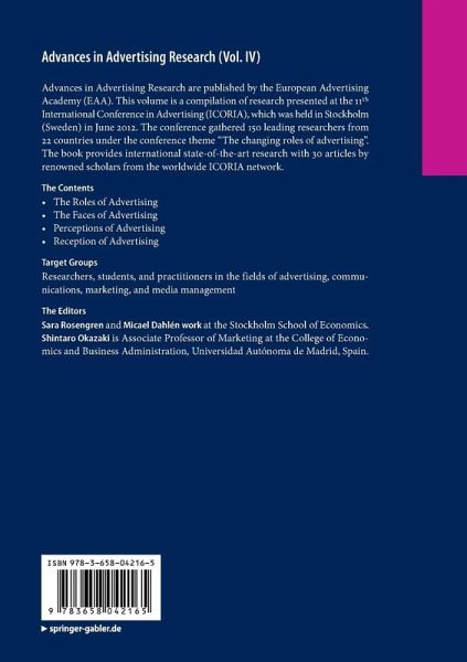 Advances in Advertising Research are published by the European Advertising Academy (EAA). This volume is a compilation of research presented at the 11th International Conference in Advertising (ICORIA) which was held in Stockholm (Sweden) in June 2012. The conference gathered 150 leading researchers from 22 countries under the conference theme "The changing roles of advertising". The book provides international state-of-the-art research with 30 articles by renowned scholars from the worldwide ICORIA network.
