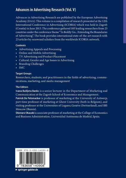 Advances in Advertising Research are published by the European Advertising Academy (EAA). This volume is a compilation of research presented at the 12th International Conference in Advertising (ICORIA) which was held in Zagreb (Croatia) in June 2013. The conference gathered 105 leading researchers from 23 countries under the conference theme "To Boldly Go... Extending the Boundaries of Advertising". The book provides international state-of-the-art research with 23 articles by renowned scholars from the worldwide ICORIA network.