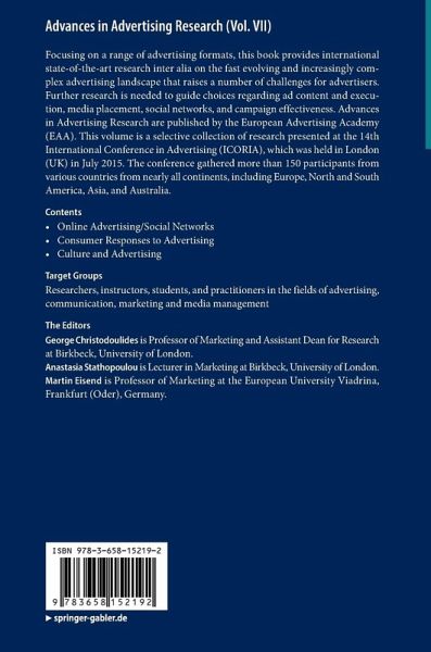 Focusing on a range of advertising formats, this book provides international state-of-the-art research inter alia on the fast evolving and increasingly complex advertising landscape that raises a number of challenges for advertisers. Further research is needed to guide choices regarding ad content and execution, media placement, social networks, and campaign effectiveness. Advances in Advertising Research are published by the European Advertising Academy (EAA). This volume is a selective collection of research presented at the 14th International Conference in Advertising (ICORIA), which was held in London (UK) in July 2015. The conference gathered more than 150 participants from various countries from nearly all continents, including Europe, North and South America, Asia, and Australia.