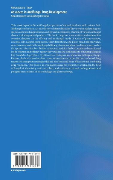 This book explores the antifungal properties of natural products and reviews their antifungal mechanism. An introductory chapter illustrates the various fungal pathogenic species, common fungal diseases, and general mechanisms of action of various antifungal classes, including natural products. The book comprises seven sections and each section contains chapters on the efficacy and antifungal mode of action of plant extracts, essential oils, natural compounds, their derivatives, and plant-based nanoparticles. A section summarizes the antifungal efficacy of compounds derived from sources other than plants, like microbes. Besides compound toxicity, the book explores the antifungal mode of action and efficacy against the virulence and pathogenicity of fungal pathogens like Candida, Aspergillus, Cryptococcus, Histoplasma, and other pathogenic fungi. Further, the book also describes recent advancements in the discovery of novel drug targets and therapeutic strategies that are non-toxic and more efficacious for combating drug resistance. This book is an invaluable source for researchers working in the field of fungal biochemistry, anti-microbial, and anti-bacterial and undergraduate and postgraduate students of microbiology and pharmacology.