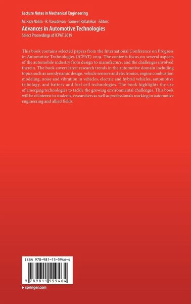 This book contains selected papers from the International Conference on Progress in Automotive Technologies (ICPAT) 2019. The contents focus on several aspects of the automobile industry from design to manufacture, and the challenges involved therein. The book covers latest research trends in the automotive domain including topics such as aerodynamic design, vehicle sensors and electronics, engine combustion modeling, noise and vibration in vehicles, electric and hybrid vehicles, automotive tribology, and battery and fuel cell technologies. The book highlights the use of emerging technologies to tackle the growing environmental challenges. This book will be of interest to students, researchers as well as professionals working in automotive engineering and allied fields.