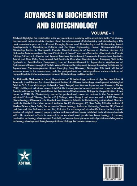 This book highlights the contribution in the very recent past made by Indian scientists in India. This Volume proves-detail and up-to-date chapters about the advancement of biochemistry and biotechnology. This book contains chapter such as Current Changing Scenario of Biotechnology and Biochemistry; Recent Developments in Chondrocyte Cultures and Cartilage Engineering; Human Granulocyte-Colony Stimulating Factor: A Therapeutic Protein; Chemical Analysis of Leaves of Cestrum diurnum (L) (Solanales: Solanaceae) and Seasonal Variation of Some Primary and Secondary Biochemicals; Protein Folding Pathways; Its Kinetics and Related Functions; Recombinant Therapeutic Proteins from Bacteria, Animal and Plant Cells; Programmed Cell Death: An Overview; Biocatalysis: An Emerging Field in the Synthesis of Eenatio-Pure Compounds; Use of Immunostimulant in Aquaculture; Application of Environmental Biotechnological Tools in Water Resource Development; Induced Breeding Techniques for Aquaculture; Pharmacogenomics Based Emerging Drug Discovery Strategies. This book will be of immense value to the researchers, both the postgraduate and undergraduate students desirous of replenishing latest information on advance of Biotechnology and Biochemistry