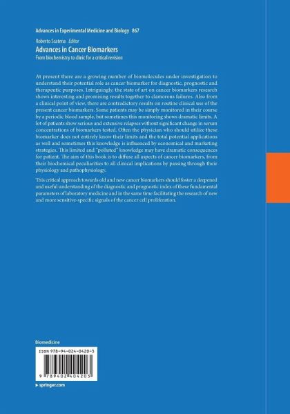 At present there are a growing number of biomolecules under investigation to understand their potential role as cancer biomarker for diagnostic, prognostic and therapeutic purposes. Intriguingly, the state of art on cancer biomarkers research shows interesting and promising results together to clamorous failures. Also from a clinical point of view, there are contradictory results on routine clinical use of the present cancer biomarkers. Some patients may be simply monitored in their course by a periodic blood sample, but sometimes this monitoring shows dramatic limits. A lot of patients show serious and extensive relapses without significant change in serum concentrations of biomarkers tested. Often the physician who should utilize these biomarker does not entirely know their limits and the total potential applications as well and sometimes this knowledge is influenced by economical and marketing strategies. This limited and "polluted" knowledge may have dramatic consequences for patient. The aim of this book is to diffuse all aspects of cancer biomarkers, from their biochemical peculiarities to all clinical implications by passing through their physiology and pathophysiology.