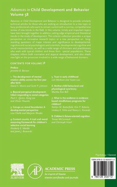 Preface Janette B. Benson 1. The development of mental rotation ability across the first year after birth David S. Moore and Scott P. Johnson 2. Beyond perceptual development: Infant responding to social categories Paul C. Quinn, Kang Lee and Olivier Pascalis 3. Groups as moral boundaries: A developmental perspective Lisa Chalik and Marjorie Rhodes 4. Content counts: A trait and moral reasoning framework for children's selective social learning Kimberly E. Marble and Janet J. Boseovski 5. Trust in early childhood Lori Markson and Yuyan Luo 6. Mother-child behavioral and physiological synchrony Martha Ann Bell 7. What is the evidence in evidence-based mindfulness programs for children? Kaitlyn M. Butterfield, Kim P. Roberts, Lindsey E. Feltis and Nancy Kocovski 8. Children's future-oriented cognition Teresa McCormack and Christoph Hoerl