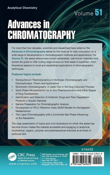 For more than four decades, scientists and researchers have relied on the Advances in Chromatography series for the most up-to-date information on a wide range of developments in chromatographic methods and applications. For Volume 51, the series editors have invited established, well-known chemists from across the globe to offer cutting-edge reviews on their areas of expertise-from theoretical aspects to novel and established applications of chromatographic techniques. Featured topics include Nonequilibrium Thermodynamics in Nonlinear Chromatography and Electrophoresis: Theory and Applications Biomimetic Chromatography: A Useful Tool in the Drug Discovery Process Solid-Phase Microextraction for In Vivo Pharmacokinetics and Other Stages of Drug Development Identification and Detection of Antibiotic Drugs and Their Degradation Products in Aquatic Samples Sample Preparation for Chromatographic Analysis Development of HPLC Retention Index QSAR Models for Nontargeted Metabolomics Thin Layer Chromatography with a Controlled Gas Phase Influencing on the Separation The clear presentation of topics and vivid illustrations for which this series has become known makes the material accessible and engaging to analytical, biochemical, organic, polymer, and pharmaceutical chemists at all levels of technical skill.