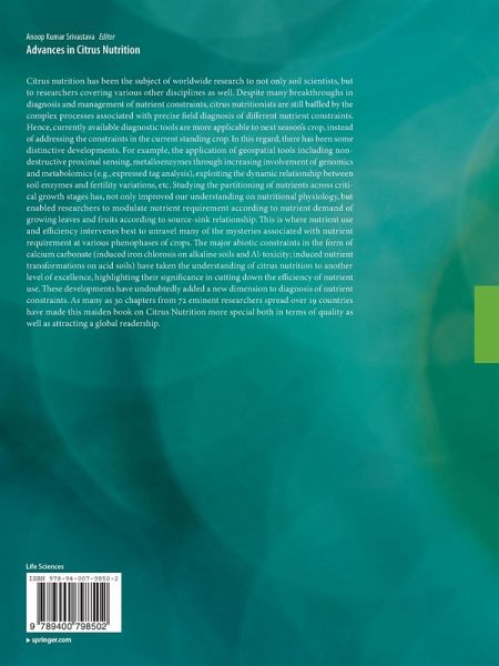 Plant Nutrition and Defense Mechanism: Frontier Knowledge.- Antioxidant System in Citrus under Nutrient Stress Conditions: Latest Developments.- Phytopnoic Nutrients in Citrus : Biochemical and Molecular Evidence.- Foliar Nutrition: Current State of Knowledge and Opportunities.- Leaf Analysis in Citrus : Interpretation Tools.- Leaf Analysis in Citrus : Developments in Analytical Techniques.- Juice Analysis in Citrus: Latest Developments.- Trunk Nutrition.- Non-destructive Proximal Sensing for Early Detection of Citrus Nutrient and Water Stress.- Spectral Response of Citrus and their Application to Nutrient and Water Constraints Diagnosis.- Soil Enzyme Activities and Soil Fertility Dynamics.- Surfactant and Nutrient Uptake in Citrus.- Rhizosphere Microbial Communities: Isolation, Characterization and Value Addition for Substrate Development.- Biodynamic Soil Fertility Management.- Nutrient Use Efficiency in Citrus.- Nitrogen Citrus : Signal, Nutrient and Use Efficiency.- NitrogenMetabolism in Citrus Based on Expressed Tag Analysis.- Variable Rate Application of Fertilizer in Citrus.- Open Field Hydroponics: Concept and Application.- Fertigation: Concept and Application in Citrus.- Nutrient-Hormone Interactions in Citrus: Physiological Implications.- Lime-Induced Chlorosis in Citrus: Diagnoses Through Physiological and Metabolic Evidences.- Mycorrhiza in Citrus: Growth and Nutrition.- Organic Citrus: Soil Fertility and Plant Nutrition Management.- Integrated Nutrient Management in Citrus.- Citrus Best Management Practices.- Economic Analysis of Conventional and Alternative Nutrient Management Approaches.- Assessing Salinity Tolerance in Citrus: Latest Developments.- Physiological Responses and Tolerance of Citrus to Aluminum-Toxicity.- Fruit yield Estimation Through Multi-Spectral Imaging.