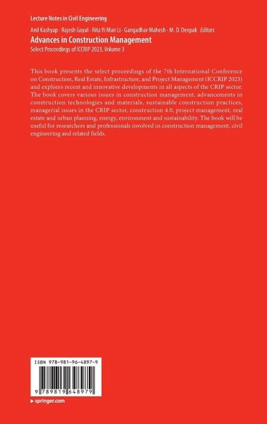 This book presents the select proceedings of the 7th International Conference on Construction, Real Estate, Infrastructure, and Project Management (ICCRIP 2023) and explores recent and innovative developments in all aspects of the CRIP sector. The book covers various issues in construction management, advancements in construction technologies and materials, sustainable construction practices, managerial issues in the CRIP sector, construction 4.0, project management, real estate and urban planning, energy, environment and sustainability. The book will be useful for researchers and professionals involved in construction management, civil engineering and related fields.