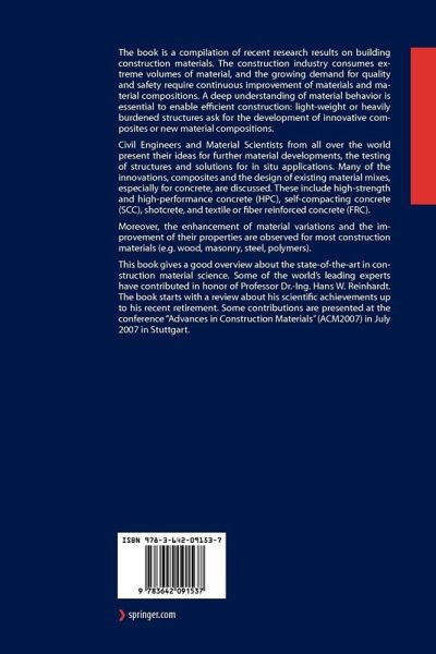 Brief Review of the Scientific Work of Prof. Dr.-Ing. Hans W. Reinhardt.- Towards a better visibility of outstanding research.- Aspects of Structural Engineering.- Fiber Composites.- Repair Materials and Strengthening Methods.- High Temperature and Fire Resistance.- Corrosion and Durability.- Properties, Modeling and Testing of Fresh Concrete.- Non-destructive Testing Methods and Applications.- Environment and Sustainability.- Mechanical and Thermal Properties of Materials.