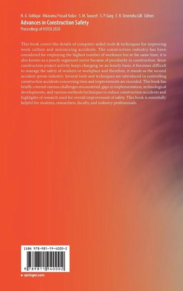 This book covers the details of computer-aided tools & techniques for improving work culture and minimizing accidents. The construction industry has been considered for employing the highest number of workmen but at the same time, it is also known as a poorly organized sector because of peculiarity in construction. Since construction project activity keeps changing on an hourly basis, it becomes difficult to manage the safety of workers or workplace and therefore, it stands as the second accident-prone industry. Several tools and techniques are introduced in controlling construction accidents concerning time and improvements are recorded. This book has briefly covered various challenges encountered, gaps in implementation, technological developments, and various methods/techniques to reduce construction accidents and highlights of research need for overall improvement of safety. This book is essentially helpful for students, researchers, faculty, and industry professionals.