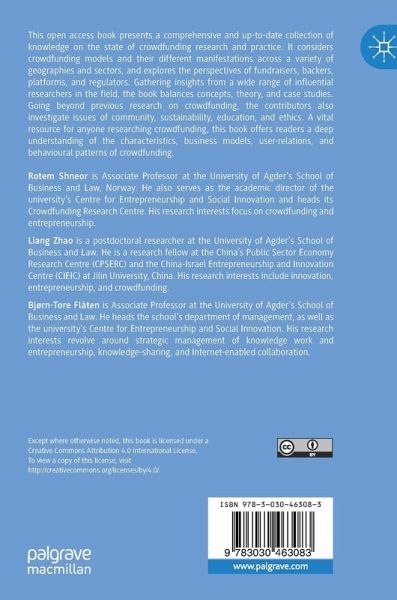 Rotem Shneor is Associate Professor at the University of Agder's School of Business and Law, Norway. He also serves as the academic director of the university's Centre for Entrepreneurship and Social Innovation and heads its Crowdfunding Research Centre. His research interests focus on crowdfunding and entrepreneurship. Liang Zhao is a postdoctoral researcher at the University of Agder's School of Business and Law. He is a research fellow at the China's Public Sector Economy Research Centre (CPSERC) and the China-Israel Entrepreneurship and Innovation Centre (CIEIC) at Jilin University, China. His research interests include innovation, entrepreneurship, and crowdfunding.  Bjørn-Tore Flåten is Associate Professor at the University of Agder School of Business and Law. He heads the school's department of management, as well as the university's Centre for Entrepreneurship and Social Innovation. His research interests revolvearound strategic management of knowledge work and entrepreneurship, knowledge-sharing, and Internet-enabled collaboration.