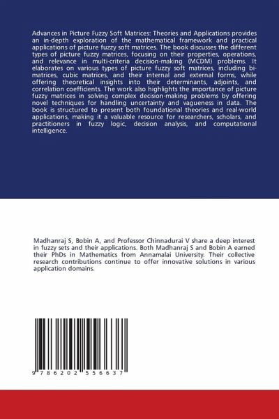Advances in Picture Fuzzy Soft Matrices: Theories and Applications provides an in-depth exploration of the mathematical framework and practical applications of picture fuzzy soft matrices. The book discusses the different types of picture fuzzy matrices, focusing on their properties, operations, and relevance in multi-criteria decision-making (MCDM) problems. It elaborates on various types of picture fuzzy soft matrices, including bi-matrices, cubic matrices, and their internal and external forms, while offering theoretical insights into their determinants, adjoints, and correlation coefficients. The work also highlights the importance of picture fuzzy matrices in solving complex decision-making problems by offering novel techniques for handling uncertainty and vagueness in data. The book is structured to present both foundational theories and real-world applications, making it a valuable resource for researchers, scholars, and practitioners in fuzzy logic, decision analysis, andcomputational intelligence.