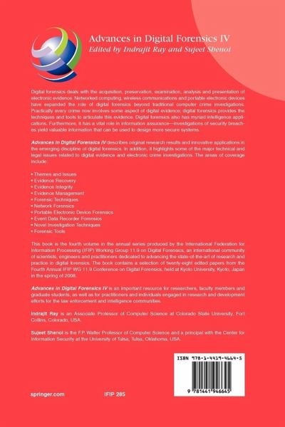 Practically every crime now involves some aspect of digital evidence. This is the most recent volume in the Advances in Digital Forensics series. It describes original research results and innovative applications in the emerging discipline of digital forensics. In addition, it highlights some of the major technical and legal issues related to digital evidence and electronic crime investigations. This book contains a selection of twenty-eight edited papers from the Fourth Annual IFIP WG 11.9 Conference on Digital Forensics, held at Kyoto University, Kyoto, Japan in the spring of 2008.