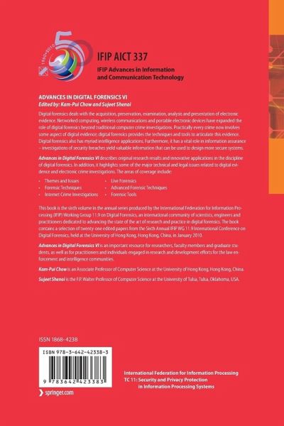 Advances in Digital Forensics VI describes original research results and innovative applications in the discipline of digital forensics. In addition, it highlights some of the major technical and legal issues related to digital evidence and electronic crime investigations. The areas of coverage include: Themes and Issues, Forensic Techniques, Internet Crime Investigations, Live Forensics, Advanced Forensic Techniques, and Forensic Tools. This book is the sixth volume in the annual series produced by the International Federation for Information Processing (IFIP) Working Group 11.9 on Digital Forensics, an international community of scientists, engineers and practitioners dedicated to advancing the state of the art of research and practice in digital forensics. The book contains a selection of twenty-one edited papers from the Sixth Annual IFIP WG 11.9 International Conference on Digital Forensics, held at the University of Hong Kong, Hong Kong, China, in January 2010.