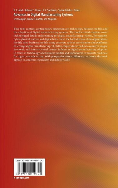 This book contains contemporary discussions on technology, business models, and the adoption of digital manufacturing systems. The book's initial chapters cover technological details underpinning the digital manufacturing systems, for example, cyber-physical systems and digital twins. Next, the book discusses how organizations modify their business models using concepts such as servitization and platforms to leverage digital manufacturing. The latter chapters focus on how a country's unique economic and infrastructural context influences digital manufacturing adoption in terms of technology and business models and frameworks to evaluate readiness for digital manufacturing. With perspectives from different continents, the book appeals to academic researchers and industry alike.