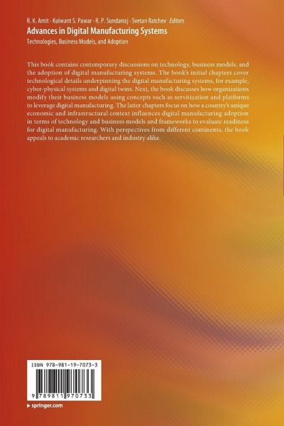 This book contains contemporary discussions on technology, business models, and the adoption of digital manufacturing systems. The book's initial chapters cover technological details underpinning the digital manufacturing systems, for example, cyber-physical systems and digital twins. Next, the book discusses how organizations modify their business models using concepts such as servitization and platforms to leverage digital manufacturing. The latter chapters focus on how a country's unique economic and infrastructural context influences digital manufacturing adoption in terms of technology and business models and frameworks to evaluate readiness for digital manufacturing. With perspectives from different continents, the book appeals to academic researchers and industry alike.