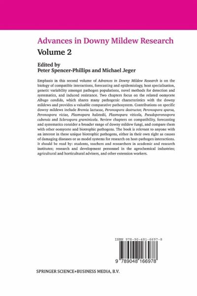 Emphasis in this second volume of Advances in Downy Mildew Research is on the biology of compatible interactions, forecasting and epidemiology, host specialisation, genetic variability amongst pathogen populations, novel methods for detection and systematics, and induced resistance. Two chapters focus on the related oomycete Albugo candida, which shares many pathogenic characteristics with the downy mildews and provides a valuable comparative pathosystem. Contributions on specific downy mildews include Bremia lactucae, Peronospora destructor, Peronospora sparsa, Peronospora viciae, Plasmopara halstedii, Plasmopara viticola, Pseudoperonospora cubensis and Sclerospora graminicola. Review chapters on compatibility, forecasting and systematics consider a broader range of downy mildew fungi, and compare them with other oomycete and biotrophic pathogens. The book is relevant to anyone with an interest in these unique biotrophic pathogens, either in their own right as causes of damagingdiseases or as model systems for research on host-pathogen interactions. It should be read by: students, teachers and researchers in academic and research institutes; research and development personnel in the agrochemical industries; agricultural and horticultural advisers, and other extension workers.