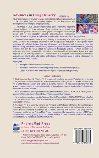 Advances in drug delivery is a very specialized area of pharmaceutics where in the principles and technologies applied in the formulation and development, are emerging and progressing. Advances in Drug Delivery incorporates latest information regarding various subjects of drug delivery. Drug delivery is a broad term encompassing various means of achieving optimum drug reach to the target tissue, cell or the receptor. Several preformulation, formulation, biopharmaceutical, targeting and pharmacokinetic principles are applied in drug delivery. Research and development in drug delivery is increasing at a rapid pace throughout the world. The need for increased efficiency of new therapies and reduction in future public health expenses will definitely bolster this area of research and development. In order to meet this demand, many well known and efficiently applied drugs will be reformulated in new drug delivery systems that can be value-added for optimized therapeutic activity. Further, several new molecules are being generated by medicinal chemists and their formulation is not any more empirical but it is now very systematic. The aim of book is to enlighten pharmaceutical scientists all around the world with latest information on the topics which are involved in cutting edge growth of pharma research and industry. Highlights • A chapter on hot melt extrusion is included • Included a chapter on oral disintegrating tablets - a value addition product • Caters to all those who aim to achieve higher objectives in drug delivery