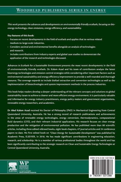 Advances in Eco-fuels for Sustainable Environment presents the most recent developments in the field of environmentally friendly eco-fuels. Dr. Kalad Azad and his team of contributors analyze the latest bio-energy technologies and emission control strategies, while also considering other important factors, such as environmental sustainability and energy efficiency improvement. Coverage includes biofuel extraction and conversion technologies, the implementation of biotechnologies and system improvement methods in the process industries. This book will help readers develop a deeper understanding…mehr