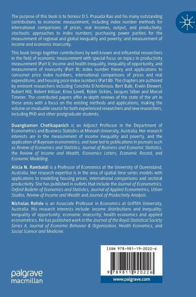 Part I Productivity Measurement.- 1. Productivity Measurement - Past, Present and Future.- 2. Symmetric Decompositions of Aggregate Output and Labour Productivity Growth: On Levels, (Non-) Additivity, and Misallocation.- 3. Efficiency Analysis with Stochastic Frontier Models using Popular Statistical Softwares.- 4. Efficiency and Productivity Analysis from a System Perspective: Historical Overview.- Part II Income Distributions and Inequality and Insecurity.- 5. Modelling Income Distributions with Limited Data.- 6. Empirical Methods for Modelling Economic Insecurity.- 7. Measuring Inequality in Health.- 8. Inequality of Opportunity:Theoretical Considerations and Recent Empirical Evidence.- Part III Index Numbers and International Comparisons of Prices and Real Expenditures.- 9. Framing Measurement Beyond GDP.- 10. Hedonic Models and House Price Index Numbers.- 11. Scanner Data, Elementary Price Indexes and the Chain Drift Problem.- 12. The Stochastic Approach to International Price Comparisons.- 13. Inconsistencies in Cross-country Price Comparisons Over Time: Patterns and Facts.