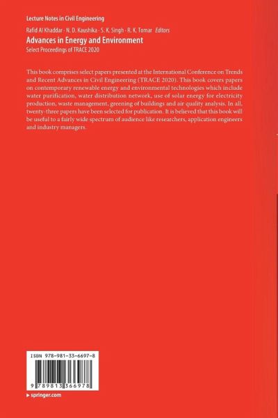 This book comprises select papers presented at the International Conference on Trends and Recent Advances in Civil Engineering (TRACE 2020). This book covers papers on contemporary renewable energy and environmental technologies which include water purification, water distribution network, use of solar energy for electricity production, waste management, greening of buildings and air quality analysis. In all, twenty-three papers have been selected for publication. It is believed that this book will be useful to a fairly wide spectrum of audience like researchers, application engineers and industry managers.…mehr