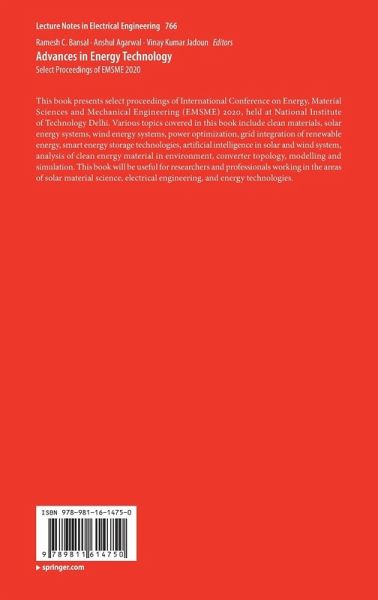This book presents select proceedings of International Conference on Energy, Material Sciences and Mechanical Engineering (EMSME) 2020, held at National Institute of Technology Delhi. Various topics covered in this book include clean materials, solar energy systems, wind energy systems, power optimization, grid integration of renewable energy, smart energy storage technologies, artificial intelligence in solar and wind system, analysis of clean energy material in environment, converter topology, modelling and simulation. This book will be useful for researchers and professionals working in the…mehr
