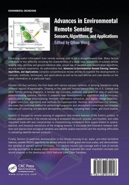Generating a satisfactory classification image from remote sensing data is not a straightforward task. Many factors contribute to this difficulty including the characteristics of a study area, availability of suitable remote sensing data, ancillary and ground reference data, proper use of variables and classification algorithms, and the analyst's experience. An authoritative text, Advances in Environmental Remote Sensing: Sensors, Algorithms, and Applications compiles comprehensive review articles to examine the developments in concepts, methods, techniques, and applications as well as focused articles and case studies on the latest on a particular topic. Divided into four sections, the first deals with various sensors, systems, or sensing operations using different regions of wavelengths. Drawing on the data and lessons learned from the U.S. Landsat remote sensing programs, it reviews key concepts, methods, and practical uses of particular sensors/sensing systems. Section II presents new developments in algorithms and techniques, specifically in image preprocessing, thematic information extraction, and digital change detection. It gives correction algorithms for hyperspectral, thermal, and multispectral sensors, discusses the combined method for performing topographic and atmospheric corrections, and provides examples of correcting non-standard atmospheric conditions, including haze, cirrus, and cloud shadow. Section III focuses on remote sensing of vegetation and related features of the Earth's surface. It reviews advancements in the remote sensing of ecosystem structure, process, and function, and notes important trade-offs and compromises in characterizing ecosystems from space related to spatial, spectral, and temporal resolutions of the imaging sensors. It discusses the mismatch between leaf-level and species-level ecological variables and satellite spatial resolutions and the resulting difficulties in validating satellite-derived products. Finally, Section IV examines developments in the remote sensing of air, water, and other terrestrial features, reviews MODIS algorithms for aerosol retrieval at both global and local scales, and demonstrates the retrieval of aerosol optical thickness (AOT). This section rounds out coverage with a look at remote sensing approaches to measure the urban environment and examines the most important concepts and recent research.