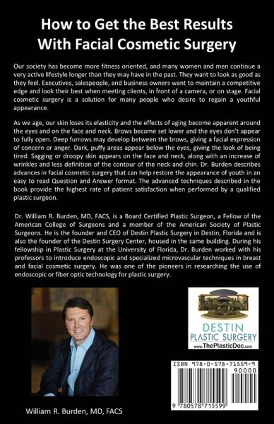This book provides an overview of facial cosmetic surgical procedures. Our society has become more fitness oriented, and many women and men continue a very active lifestyle longer than they may have in the past. They want to look as good as they feel. Executives, salespeople, and business owners want to maintain a competitive edge and look their best when meeting clients, in front of a camera, or on stage. Facial cosmetic surgery is a solution for many people who desire to regain a youthful appearance. As we age, our skin loses its elasticity and the effects of aging become apparent around the eyes and on the face and neck. Brows become set lower and the eyes don't appear to fully open. Deep furrows may develop between the brows, giving a facial expression of concern or anger. Dark, puffy areas appear below the eyes, giving the look of being tired. Sagging or droopy skin appears on the face and neck, along with an increase of wrinkles and less definition of the contour of the neck and chin. Procedures explained in this book, including the endoscopic brow lift, eyelid surgery, and facelift can help restore the appearance of youth. Everyone is unique and a specific procedure, or a combination of procedures, may be recommended for the best results. Dr. Burden provides some background on his research starting back in the 1990s on newer approaches to plastic surgery using fiber optics that allowed smaller incisions and less invasive procedures. He describes advances that have been made in facial cosmetic surgery in an easy to read Question and Answer format. The advanced techniques described in the book help regain a youthful appearance and provide the highest rate of patient satisfaction when performed by a qualified plastic surgeon. Dr. William R. Burden, MD, FACS, is a Board Certified Plastic Surgeon, a Fellow of the American College of Surgeons and a member of the American Society of Plastic Surgeons. He is the founder and CEO of Destin Plastic Surgery in Destin, Florida and is also the founder of the Destin Surgery Center, housed in the same building. During his fellowship in Plastic Surgery at the University of Florida, Dr. Burden worked with his professors to introduce endoscopic and specialized microvascular techniques in breast and facial cosmetic surgery. He was one of the pioneers in researching the use of endoscopic or fiber optic technology for plastic surgery.