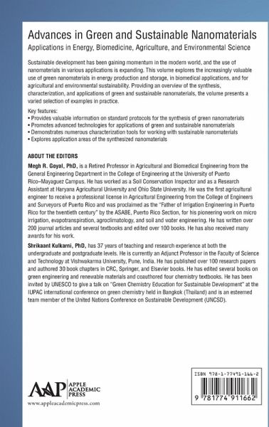 Megh R. Goyal, PhD, PE, is a Retired Professor in Agricultural and Biomedical Engineering from the General Engineering Department in the College of Engineering at the University of Puerto Rico-Mayaguez Campus. He has worked as a Soil Conservation Inspector and as a Research Assistant at Haryana Agricultural University and Ohio State University. He was the first agricultural engineer to receive the professional license in Agricultural Engineering from the College of Engineers and Surveyors of Puerto Rico and was proclaimed as the "Father of Irrigation Engineering in Puerto Rico for the twentieth century" by the ASABE, Puerto Rico Section, for his pioneering work on micro irrigation, evapotranspiration, agroclimatology, and soil and water engineering. During his professional career of over 52 years, he has received many prestigious awards. A prolific author and editor, he has written over 200 journal articles and several textbooks and has edited over 100 books. He has also received many awards for his work. Shrikaant Kulkarni, PhD, has 37 years of teaching and research experience at both the undergraduate and postgraduate levels. He is currently an Adjunct Professor in the Faculty of Science and Technology at Vishwakarma University, Pune, India. He has published over 100 research papers and authored 30 book chapters in CRC, Springer, and Elsevier books. He has edited several books on green engineering and renewable materials and coauthored four chemistry textbooks. He has been invited by UNESCO to give a talk on "Green Chemistry Education for Sustainable Development" at the IUPAC international conference on green chemistry held at Bangkok (Thailand) and is an esteemed team member of the United Nations Conference on Sustainable Development (UNCSD).
