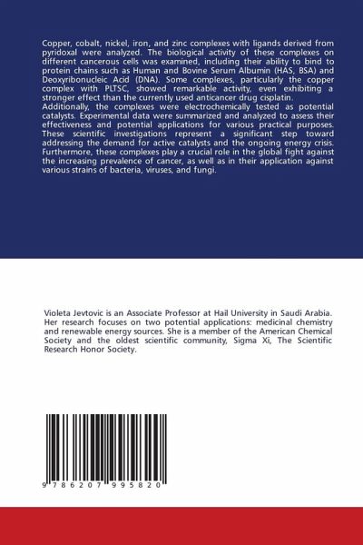 Copper, cobalt, nickel, iron, and zinc complexes with ligands derived from pyridoxal were analyzed. The biological activity of these complexes on different cancerous cells was examined, including their ability to bind to protein chains such as Human and Bovine Serum Albumin (HAS, BSA) and Deoxyribonucleic Acid (DNA). Some complexes, particularly the copper complex with PLTSC, showed remarkable activity, even exhibiting a stronger effect than the currently used anticancer drug cisplatin.Additionally, the complexes were electrochemically tested as potential catalysts. Experimental data were summarized and analyzed to assess their effectiveness and potential applications for various practical purposes. These scientific investigations represent a significant step toward addressing the demand for active catalysts and the ongoing energy crisis. Furthermore, these complexes play a crucial role in the global fight against the increasing prevalence of cancer, as well as in their application against various strains of bacteria, viruses, and fungi.