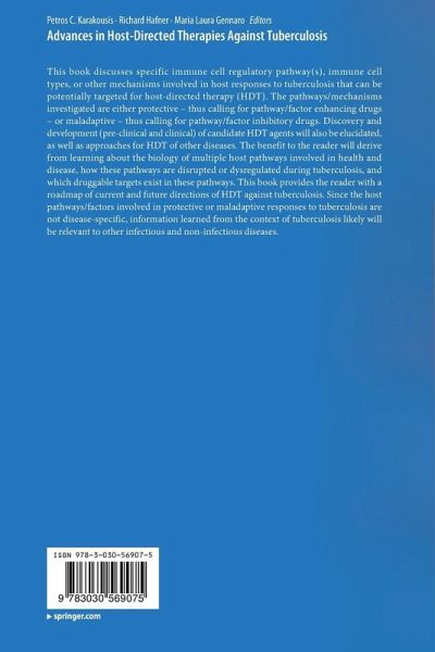 This book discusses specific immune cell regulatory pathway(s), immune cell types, or other mechanisms involved in host responses to tuberculosis that can be potentially targeted for host-directed therapy (HDT). The pathways/mechanisms investigated are either protective - thus calling for pathway/factor enhancing drugs - or maladaptive - thus calling for pathway/factor inhibitory drugs. Discovery and development (pre-clinical and clinical) of candidate HDT agents will also be elucidated, as well as approaches for HDT of other diseases. The benefit to the reader will derive from learning about the biology of multiple host pathways involved in health and disease, how these pathways are disrupted or dysregulated during tuberculosis, and which druggable targets exist in these pathways. This book provides the reader with a roadmap of current and future directions of HDT against tuberculosis. Since the host pathways/factors involved in protective or maladaptive responses to tuberculosis are not disease-specific, information learned from the context of tuberculosis likely will be relevant to other infectious and non-infectious diseases.