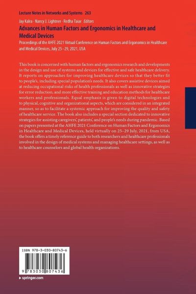 This book is concerned with human factors and ergonomics research and developments in the design and use of systems and devices for effective and safe healthcare delivery. It reports on approaches for improving healthcare devices so that they better fit to people's, including special population's needs. It also covers assistive devices aimed at reducing occupational risks of health professionals as well as innovative strategies for error reduction, and more effective training and education methods for healthcare workers and professionals. Equal emphasis is given to digital technologies and to physical, cognitive and organizational aspects, which are considered in an integrated manner, so as to facilitate a systemic approach for improving the quality and safety of healthcare service. The book also includes a special section dedicated to innovative strategies for assisting caregivers', patients', and people's needs during pandemic. Based on papers presented at the AHFE 2021 Conference on Human Factors and Ergonomics in Healthcare and Medical Devices, held virtually on 25-29 July, 2021, from USA, the book offers a timely reference guide to both researchers and healthcare professionals involved in the design of medical systems and managing healthcare settings, as well as to healthcare counselors and global health organizations.