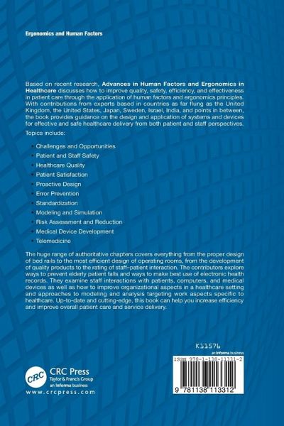 Based on recent research, this book discusses how to improve quality, safety, efficiency, and effectiveness in patient care through application of human factors and ergonomics principles. It provides guidance on the design and application of systems and devices for healthcare delivery, from both a patient and staff perspective. It covers everything from the proper design of bed rails to the most efficient design of operating rooms to analysis of staff-patient interaction. It also supplies a way to improve organizational aspects and approaches to modeling, targeting work aspects specific to healthcare settings.