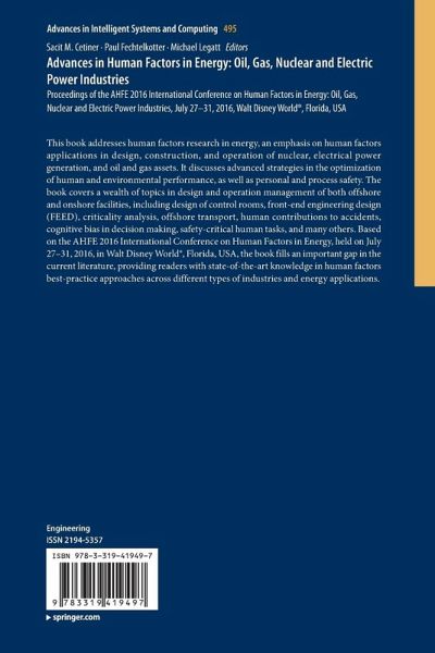 This book addresses human factors research in energy, an emphasis on human factors applications in design, construction, and operation of nuclear, electrical power generation, and oil and gas assets. It discusses advanced strategies in the optimization of human and environmental performance, as well as personal and process safety. The book covers a wealth of topics in design and operation management of both offshore and onshore facilities, including design of control rooms, front-end engineering design (FEED), criticality analysis, offshore transport, human contributions to accidents, cognitive bias in decision making, safety-critical human tasks, and many others. Based on the AHFE 2016 International Conference on Human Factors in Energy, held on July 27-31, 2016, in Walt Disney World®, Florida, USA, the book fills an important gap in the current literature, providing readers with state-of-the-art knowledge in human factors best-practice approaches across different types of industries and energy applications.
