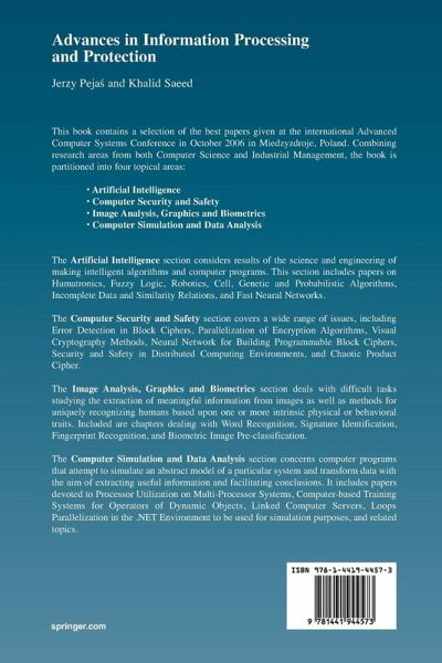 Artificial Intelligence.- Humatronics and RT-Middleware.- A Fuzzy Way to Measure Quality of Work in a Multidimensional Perspective.- Application of the Peano Curve for the Robot Trajectory Generating.- On Some Properties of the B-Cell Algorithm in Non-Stationary Environments.- The Grouping of Valuations in Probabilistic Algorithms.- Inverted Lists Compression Using Contextual Information.- Hybrid Intelligent Diagnosis Approaches: Analysis and Comparison under a Biomedicine Application.- Predicting Incomplete Data on the Basis of Non Symmetric Similarity Relation.- Methods of Designing and System Analysis of Fast Neural Networks and Linear Tunable Transformations.- Minimal Coverage of Investigated Object when Seeking for its Fractal Dimension.- Networked Robots Personal Tastes Acquisition and Sharing.- Reduction of Rules of a Fuzzy Model with a Chain Model.- Singleton Representation of Fuzzy Set for Computing Fuzzy Model Response for Fuzzy Inputs.- Tuning of Parameters Backstepping Ship Course Controller by Genetic Algorithm.- Visualization of Five Erosion Risk Classes using Kernel Discriminants.- Computer Security and Safety.- Multiple Error Detection in Substitution Blocks for Block Ciphers.- Parallelization Method of Encryption Algorithms.- When a Family of Iris Flower is Normal, Then are Others Abnormal?.- Strong Boolean Functions with Compact ANF Representation.- Visual Cryptography Methods as a Source of Trustworthiness for the Signature Creation and Verification Systems.- Neural Network as a Programmable Block Cipher.- On Intermediate Evaluation of Block Ciphers.- Development of Concealing the Purpose of Processing for Programs in a Distributed Computing Environment.- Covert Channel for Improving VoIP Security.- Cryptanalysis of Chaotic Product Cipher.- Embeddingof Stego-Messages in Monochrome Images on the Base of Rank Filtering.- Image Analysis, Graphics and Biometrics.- JPEG 2000 Image Coding Standard - A Review and Applications.- New Experiments on Word Recognition Without Segmentation.- Signature Verification by View-Based Feature Extractor and DTW Classifier.- Increasing Performance of Fingerprint Recognition Systems Using Reconstruction of Ridge Lines Methods.- Design and Prototyping of an Industrial Fault Clustering System Combining Image Processing and Artificial Neural Network Based Approaches.- Image Pre-classification for Biometrics Identification Systems.- Application of Improved Projection Method to Binary Images.- Computer Simulation and Data Analysis.- A Consideration of Processor Utilization on Multi-Processor System.- Reliability of Node Information on Autonomous Load Distribution Method.- Methodology of Developing Computer-Based Training Systems for Operators of Dynamic Objects.- Algorithms of Identification of Multi-connected Boundary Geometry and Material Parameters in Problems Described by Navier-Lame Equation Using the PIES.- Analysis of an Open Linked Series Three-station Network with Blocking.- Hyperplane Method Implementation for Loops Parallelization in the .NET Environment.- On a Nonlinear Production-Inventory Problem.