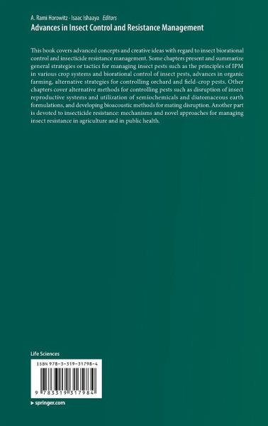 1. Advances in Insect Control and in Resistance Management: an Overview.- 2. Principles of IPM in Cultivated Crops and Implementation of Innovative Strategies for Sustainable Plant Protection.- 3. Biological Control and Pollination Services on Organic Farms.- 4. The Evolution of Alternative Control Strategies in a Traditional Crop: Economy and Policy as Drivers of Olive Fly Control.- 5. Enhancing Resistance Management and Performance of Biorational Insecticides with Novel Delivery Systems in Tree Fruit IPM.- 6. Manipulation of Insect Reproductive Systems as a Tool in Pest Control.- 7. The Zoophytophagous Predator Nesidiocoris tenuis: a Successful but Controversial Biocontrol Agent in Tomato Crops.- 8. Development of Semiochemicals and Diatomaceous Earth Formulations for Bed Bug Pest Management.- 9. Developing a Bioacoustic Method for Mating Disruption of a Leafhopper Pest in Grapevine.- 10. Cell-based Screening Systems for Developing Novel Insecticides: Insights from the EcR-Reporter Paradigm.- 11. Control and Resistance Monitoring of Thrips and Whiteflies.- 12. Resistance to Diamide Insecticides in Lepidopteran Pests.- 13. Resistance Mechanisms of Helicoverpa armigera.- 14. Advances in Managing Pest Resistance to Bt Crops: Pyramids and Seed Mixtures.- 15. Insecticide Resistance and its Impact on Vector Control.- 16. Insecticide Resistance in Natural Enemies.