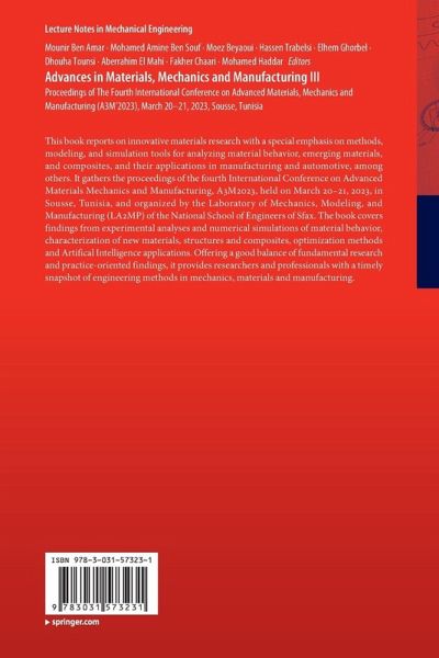 This book reports on innovative materials research with a special emphasis on methods, modeling, and simulation tools for analyzing material behavior, emerging materials, and composites, and their applications in manufacturing and automotive, among others. It gathers the proceedings of the fourth International Conference on Advanced Materials Mechanics and Manufacturing, A3M2023, held on March 20-21, 2023, in Sousse, Tunisia, and organized by the Laboratory of Mechanics, Modeling, and Manufacturing (LA2MP) of the National School of Engineers of Sfax. The book covers findings from experimental analyses and numerical simulations of material behavior, characterization of new materials, structures and composites, optimization methods and Artifical Intelligence applications. Offering a good balance of fundamental research and practice-oriented findings, it provides researchers and professionals with a timely snapshot of engineering methods in mechanics, materials and manufacturing.