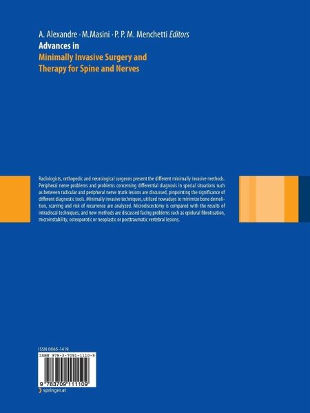 Radiologists, orthopedic and neurological surgeons present the different minimally invasive methods. Peripheral nerve problems and problems concerning differential diagnosis in special situations such as between radicular and peripheral nerve trunk lesions are discussed, pinpointing the significance of different diagnostic tools. Minimally invasive techniques, utilized nowadays to minimize bone demolition, scarring and risk of recurrence are analyzed. Microdiscectomy is compared with the results of intradiscal techniques, and new methods are discussed facing problems such as epidural fibrotisation, microinstability, osteoporotic or neoplastic or posttraumatic vertebral lesions.