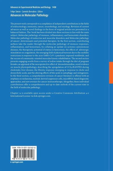 The present work corresponds to a compilation of independent contributions in the fields of endocrinology, immunity, cancer, neurobiology, and myology. Revision of current advances as well as novel findings in the form of original articles are presented in a balanced fashion. The book has been divided into three sections in line with the main subject: Molecular pathology of immune, inflammatory, and hemostatic disorders; Molecular pathology of endocrine and muscular disorders; and Molecular pathology of cancer: determinants and potential therapies. In the first section, contributing authors take the reader through the molecular pathology of immune responses, inflammation, and hemostasis, by collating an update on systemic autoimmune diseases, the therapeutic potential of statins in hemostasis, the effects of adrenergic stimulation on coagulation, the emerging field of physical burnout due to the mobility restrictions in response to the 2020 SARS-CoV-2 pandemic imposed worldwide, and the success of community-oriented muscular kinesic rehabilitation. The second section presents engaging results from a survey of iodine intake through the diet of pregnant females, an appraisal of the neuroprotective effect of dexmedetomidine, novel evidence on muscle physiopathology, describing the upregulation of CCL5/RANTES during cholestatic liver disease, the fibrotic response emerging in response to cholic and deoxycholic acids, and the altering effects of bile acids in autophagy and mitogenesis. In the third section, a comprehensive revision of cancer literature is offered with an emphasis on melanoma, myeloid-derived suppressor cells, microRNA-based diagnostic approaches, and new avenues for cancer immunotherapy. Altogether, these individual contributions offer a comprehensive and up-to-date outlook of the current state in the field of molecular pathology.
