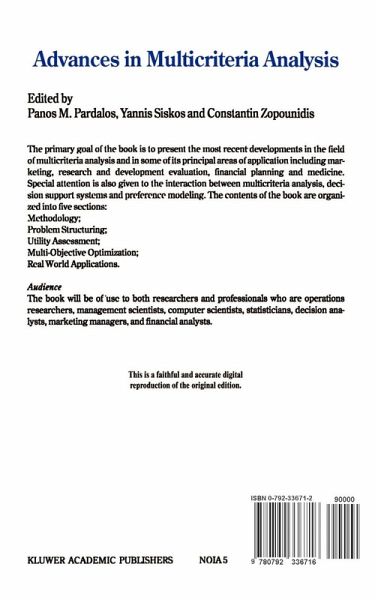As its title implies, Advances in Multicriteria Analysis presents the most recent developments in multicriteria analysis and in some of its principal areas of application, including marketing, research and development evaluation, financial planning, and medicine. Special attention is paid to the interaction between multicriteria analysis, decision support systems and preference modeling. The five sections of the book cover: methodology; problem structuring; utility assessment; multi-objective optimisation; real world applications.