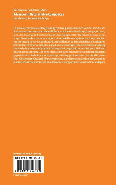 This book presents selected high-quality research papers submitted to ICNF 2017, the 3rd International Conference on Natural Fibers, which was held in Braga, Portugal, on 21-23 June 2017. It discusses the latest research and developments in the field and covers a wide range of topics related to various aspects of natural-fiber composites, such as production and processing of raw materials, surface modification and functionalization, advanced fibrous structures for composites, nano fibers, experimental characterization, modeling and analysis, design and product development, applications, market potential, and environmental impacts. The book presents the latest research work addressing different approaches and techniques to improve processing, performance, functionalities and cost-effectiveness of natural-fibers composites, in order to increase their applications in different industrial sectors such as automobiles, transportation, construction, and sport. & nbsp;
