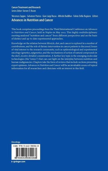 This book comprises proceedings from the Third International Conference on Advances in Nutrition and Cancer, held in Naples in May 2012. This highly multidisciplinary meeting analyzed "nutrition and cancer" from different perspectives and on the basis of distinct and up-to-date experimental approaches. Knowledge on the relation between lifestyle, diet, and cancer is explored in a number of contributions, and the role of dietary intervention in cancer patients is discussed. Issues of vital interest to the research community, such as epidemiological and experimental oncology (genetics,…mehr