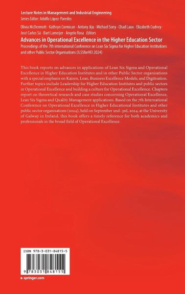 This book reports on advances in applications of Lean Six Sigma and Operational Excellence in Higher Education Institutes and in other Public Sector organisations with a special emphasis on Kaizen, Lean, Business Excellence Models, and Digitisation. Further topics include Leadership for Higher Education Institutes and public sectors in Operational Excellence and building a culture for Operational Excellence. Chapters report on theoretical research and case studies concerning Operational Excellence, Lean Six Sigma and Quality Management applications. Based on the 7th International Conference on Operational Excellence in Higher Educational Institutes and other public sector organisations (2024), held on September 2nd-3rd, 2024, at the University of Galway in Ireland, this book offers a timely reference for both academics and professionals in the broad field of Operational Excellence.