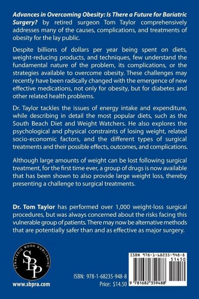 Advances in Overcoming Obesity: Is There a Future for Bariatric Surgery? by retired surgeon Tom Taylor comprehensively addresses many of the causes, complications, and treatments of obesity for the lay public. Despite billions of dollars per year being spent on diets, weight-reducing products, and techniques, few understand the fundamental nature of the problem, its complications, or the strategies available to overcome obesity. These challenges may recently have been radically changed with the emergence of new effective medications, not only for obesity, but for diabetes and other related health problems. Dr. Taylor tackles the issues of energy intake and expenditure, while describing in detail the most popular diets, such as the South Beach Diet and Weight Watchers. He also explores the psychological and physical constraints of losing weight, related socio-economic factors, and the different types of surgical treatments and their possible effects, outcomes, and complications. Although large amounts of weight can be lost following surgical treatment, for the first time ever, a group of drugs is now available that has been shown to also provide large weight loss, thereby presenting a challenge to surgical treatments. (About the Author) Dr. Tom Taylor has performed over 1,000 weight-loss surgical procedures, but was always concerned about the risks facing this vulnerable group of patients. There may now be alternative methods that are potentially safer than and as effective as major surgery.