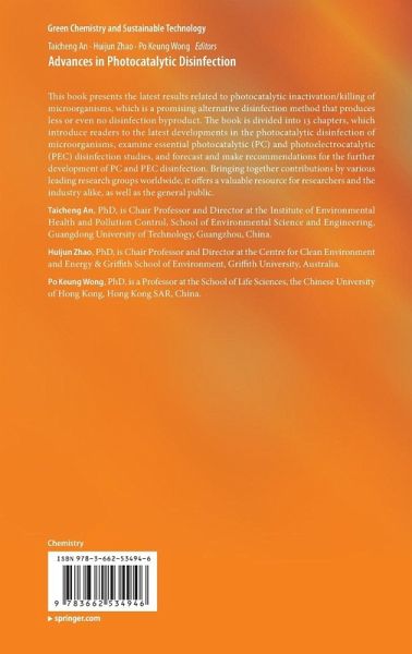 Introduction.- Visible light photocatalysis of natural semiconducting minerals.- Visible-Light-Driven Photocatalytic Treatment by Environmental Minerals.- Visible light photocatalytic inactivation by Bi-based photocatalysts.- Synthesis and Performance of Silver Photocatalytic Nanomaterials for Water Disinfection.- Solar Photocatalytic Disinfection by Nano Ag-based Photocatalyst.- Photocatalytic Disinfection by Metal-free Materials.- Disinfection of Waters/Wastewaters by Solar Photocatalysis.- Photoelectrocatalytic Materials for Water Disinfection.- Photocatalytic and Photoelectrocatalytic Inactivation Mechanism of Biohazards.- Photoelectrocatalytic Inactivation Mechanism of Bacteria.- Bacterial oxidative stress responses and cellular damage caused by photocatalytic and photoelectrocatalytic inactivation.- Mechanistic Modeling of Photocatalytic Water Disinfection.